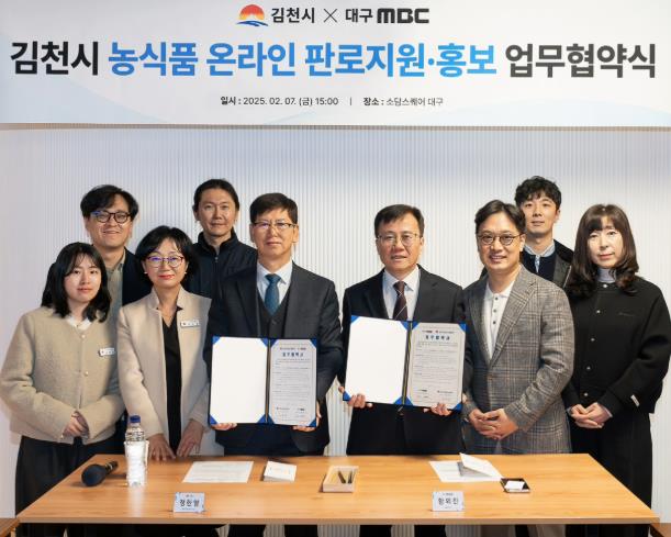 지난 2월 7일, 김천시와 대구MBC는 대구 경북지역 디지털 전환 거점 공간인‘소담스퀘어 대구’에서‘김천시 농산물 가공연합회’회원들이 참석한 가운데 김천 농식품 소상공인 온라인 상거래 활성화를 위한 업무협약을 체결했다.