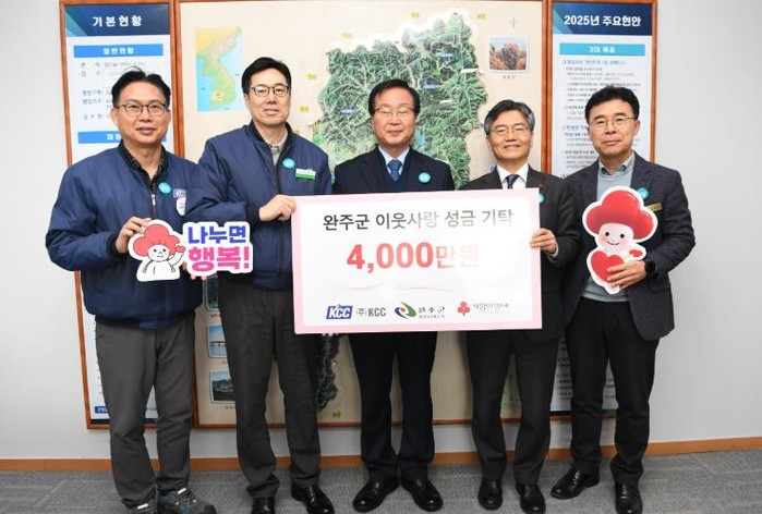 ㈜KCC가 완주군에 어려운 이웃을 위해 써달라며 전북사회복지공동모금회를 통해 4,000만 원을 기부했다.