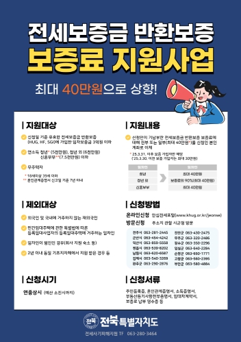 김형우 전북자치도 건설교통국장은 “보증료 지원 한도 상향은 임차인의 부담을 덜고, 제도적으로 보증 가입을 유도할 수 있는 여건을 마련한 것”이라며, “앞으로도 누구나 안심하고 거주할 수 있는 전북형 주거 안전망을 더욱 촘촘히 구축해 나가겠다”고 말했다.