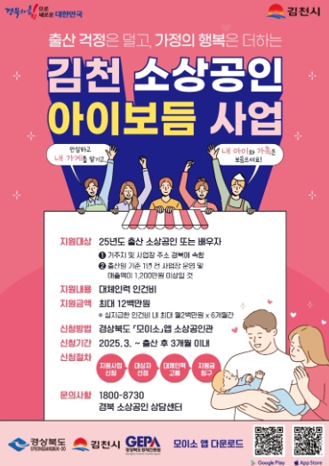 김천시는 저출생 극복과 출산 및 육아로 휴·폐업 위기에 몰린 소상공인 지원을 위해 `소상공인 아이보듬 지원사업`을 시행한다고 24일 밝혔다.