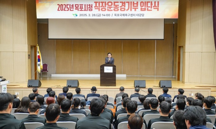 이날 입단식에는 목포시청 직장운동경기부 축구(32명), 하키(20명), 육상(8명), 복싱(3명) 선수단 등 70여 명이 참석했다.