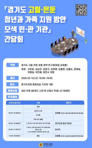 경기도의회 고립·은둔 보듬 정책 연구회가 오는 3월 19일 경기도의회 중회의실에서 '경기도 고립·은둔 청년과 가족 지원 방안 모색을 위한 민관 기관 간담회'를 개최한다.