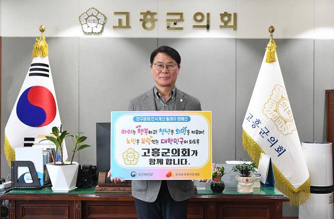 고흥군의회 류제동 의장이 지난 7일 인구감소와 고령화 문제로 인한 인구구조 변화의 심각성을 알리고, 국민들의 사회적 인식을 제고하기 위해 ‘인구문제 인식개선 릴레이 캠페인’에 동참했다.