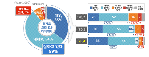 한편 코로나19에 대한 경기도 대처에 대해서는 89%의 도민이 ‘잘하고 있다’고 평가했다. 이는 2월 조사보다 17%p 상승한 수치다.
