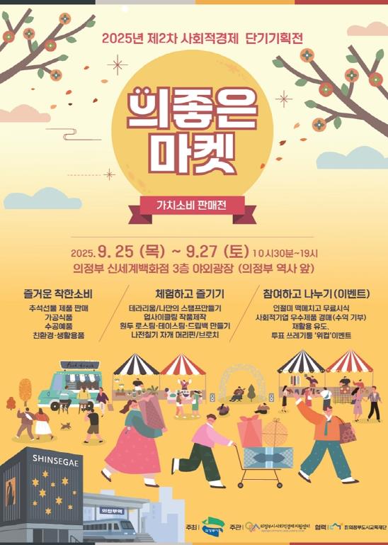 의정부시는 9월 25일부터 27일까지 3일간 신세계백화점 의정부점 야외광장 3층에서 2025년 제2차 사회적경제 단기기획전 ‘의좋은마켓’을 개최해 사회적경제기업의 판로 확대와 지역경제 활성화에 나선다.
