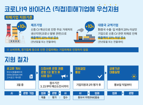 제조기업은 코로나19 영향에 따른 거래처의 생산지연으로 전년도 또는 전월보다 매출액이 10% 이상 줄었을 경우, 중국을 대상으로 한 수출·입 비중이 20% 이상인 교역기업은 매출액이 10% 이상 감소됐다면 코로나19 피해기업 기준에 해당된다.