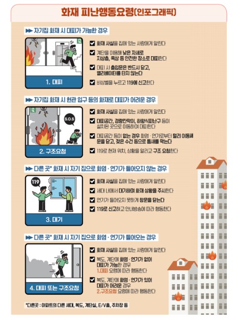 화재 지점과 연기 유입 여부에 따른 ‘상황별 피난 행동요령’ 준수 당부