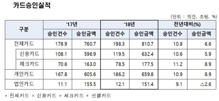 신용카드 승인 건수를 보면 2013년 70억2000만건에서 지난해 119억5000만건으로 70.2%나 급증했다.