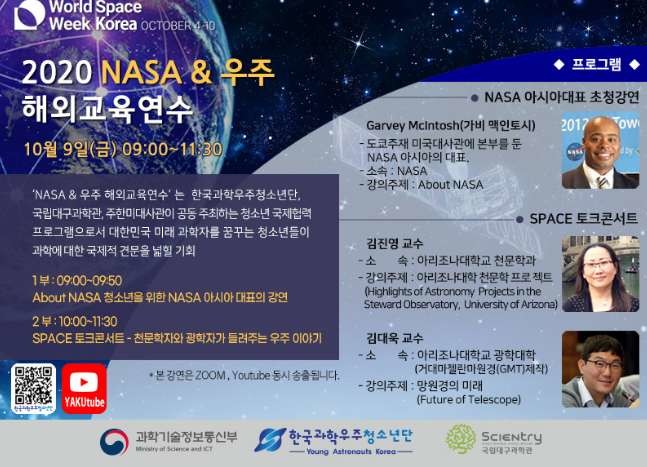 국립대구과학관과 (사)한국과학우주청소년단, 주한미대사관이 공동으로 주최하는 이번 온라인 천문학 강연은 ‘2020년 NASA와 우주 해외교육연수’가 코로나 19 여파로 취소됨에 따라 마련됐다.