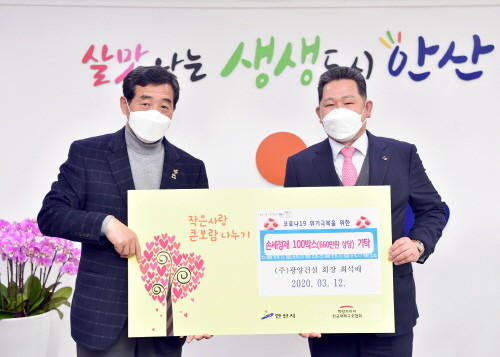 안산시(시장 윤화섭)는 ㈜광양종합건설에서 코로나바이러스감염증-19(코로나19) 확산 방지를 위해 사용해 달라며 휴대용 손소독제 1천200개(660만원 상당)을 전해왔다고 13일 밝혔다.