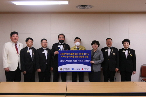 경기남부 국제라이온스협회(354-B)가 코로나19 위기 극복을 위해 성금 7백만 원과 3백만 원 상당의 마스크 2천장 등 1천만 원 상당의 성금과 성품을 경기도에 기탁했다.