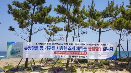 이에 동해해경 삼척파출소는 삼척시청과 업무협의를 통해 조개 불법채취가 빈번히 발생하는 삼척 맹방 및 덕산해변 일대를 중심으로 불법행위 방지 및 어족자원 보호를 위해 대형 현수막 5개를 설치했다.