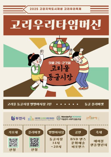 부천시는 9월 26일부터 27일까지 이틀간 오정구 고리울 동굴시장에서 ‘2025 고리우리축제’를 연다고 23일 밝혔다. 이번 행사는 부천시 원도심재생과가 주최하고 원더풀고강마을관리 사회적협동조합이 주관한다.