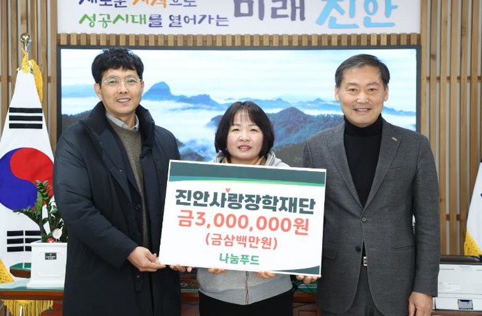 (유)나눔푸드가 5일 진안군 지역의 밝은 미래를 응원하며 진안사랑장학재단에 장학금 300만원을 기탁했다.