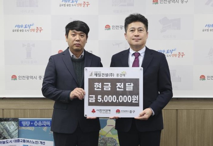 인천시 중구는 주택 브랜드 ‘풍경채’로 알려진 중견 건설사 제일건설㈜(대표이사 허만공)에서 이웃돕기 성금 500만 원을 기탁했다고 밝혔다.
