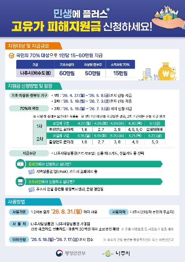전남 나주시가 중동전쟁으로 인한 고유가·고환율·고물가로 어려움을 겪고 있는 시민들의 생활 안정을 위해 고유가 피해지원금 1차 지급을 4월 27일부터 시작하며 최대 60만 원을 지원하고 찾아가는 신청 서비스를 운영한다.