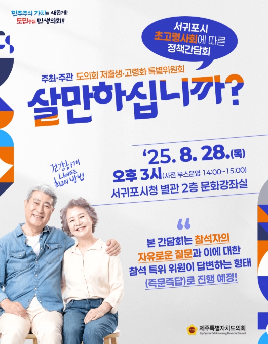 제주도의회는 28일 오후 서귀포시청 별관 문화강좌실에서 ‘서귀포시 초고령사회에 따른 정책간담회-살만하십니까?’가 열린다고 밝혔다.