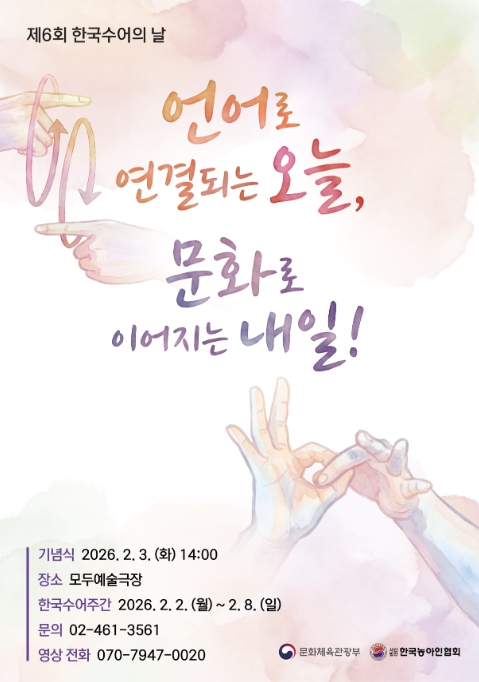 문화체육관광부는 2월 3일 오후 2시, 모두예술극장에서 ‘한국수어의 날’을 기념해 한국수어의 가치와 중요성을 널리 알리고자 ‘제6회 한국수어의 날’ 기념식을 개최한다.