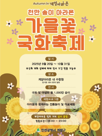 인천광역시 계양구는 인천9경 계양아라온에서 오는 9월 20일부터 10월 31일까지 ‘가을꽃 국화축제’를 개최한다고 밝혔다.