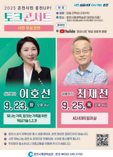 춘천시평생학습관은 23일, 25일 오후 4시, 5층 대강당에서 ‘춘천시민 충전UP! 토크콘서트’를 진행한다고 밝혔다.
