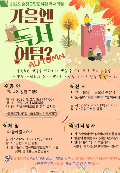 순창군은 독서의 달을 맞아 오는 27일 토요일 오후 1시부터 5시까지 순창군립도서관 광장과 다목적홀에서‘가을엔 독서 어텀(autumn)?’문화행사를 연다.