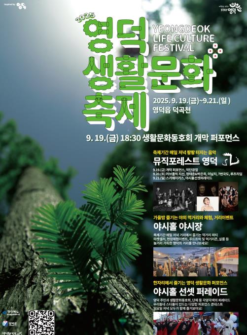 (재)영덕문화관광재단은 오는 19일부터 21일까지 영덕읍 덕곡천 천변과 일대 거리에서 다채로운 장르의 공연과 생동감 넘치는 생활문화를 함께 즐길 수 있는 '2025 영덕생활문화축제'를 사흘간 개최한다고 밝혔다.
