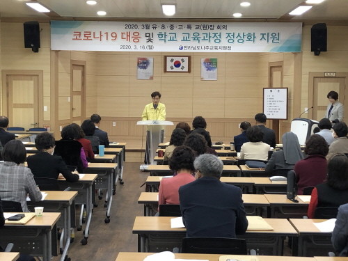 전라남도나주교육지원청(교육장 김영길)은 3월 16일(월), 나주교육지원청 대회의실에서 유.초.중.고등학교 및 특수학교 교(원)장 63명과 함께 ‘코로나19 대응 및 학교 교육과정 정상화 지원 강화’를 위한 회의를 실시하였다.