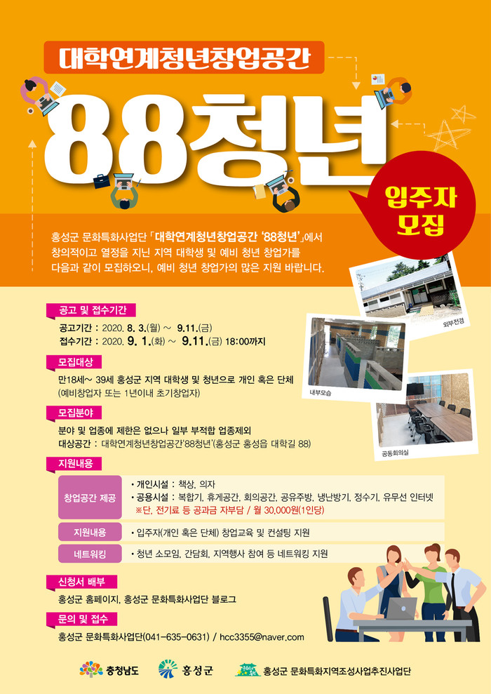 충남 홍성군 문화특화지역조성사업추진사업단(단장 이승우)은 13일 다음달 11일까지 지역청년을 위한 청년창업공간 ‘88청년’에 입주할 예비·초기 청년창업가를 모집한다고 밝혔다.