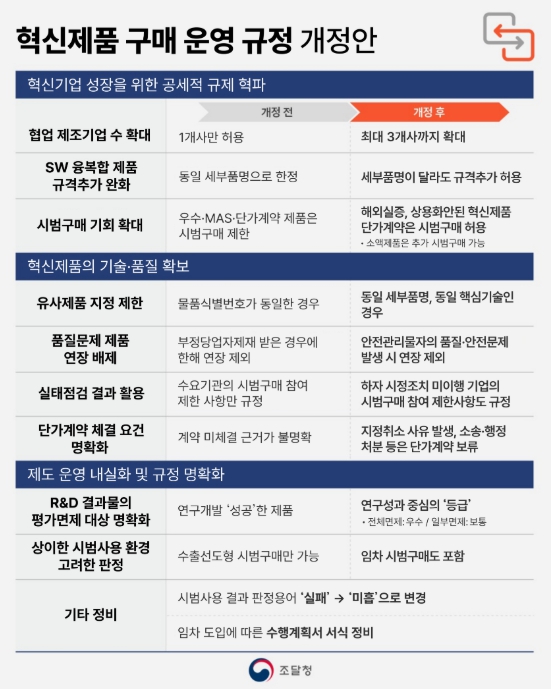 이번 규정 개정은 '공공조달 규제리셋'의 일환으로 기업이 성장하기 좋은 공공조달 환경을 조성하는 한편, 기술력 있는 혁신제품의 위상을 더 높이기 위해 이루어졌다.