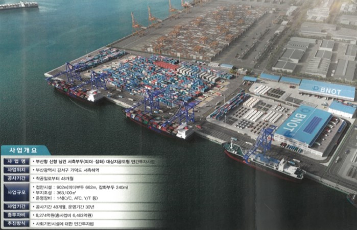 BNOT㈜는 부산항 신항 남‘컨’ 서측 부지 36만㎡에 약 8천억 원을 투자하여 2천TEU급 피더부두 2선석과 3만DWT급 잡화부두 1선석을 조성·운영하는 내용의 제안서를 제출했으며, 해양수산부와 협업하여 제안서를 보완한 후 한국개발연구원(KDI)의 적격성 검토 절차를 거치게 된다. 제안서가 적격성 검토를 통과하면 제3자 공고 등을 거쳐 사업시행자를 지정하며, 지정된 사업시행자는 실시계획 수립 후 2029년에 착공하는 것을 목표로 사업을 추진한다.