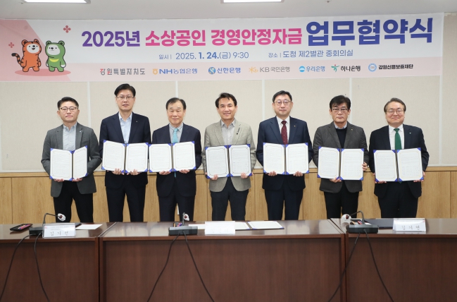 강원특별자치도가 최근 고금리와 경기침체로 극심한 경영난을 겪고 있는 도내 소상공인을 지원하기 위해 1월 24일 농협·신한·우리·국민·하나은행·강원신용보증재단 등 6개 기관과 '2025 소상공인 경영안정자금 금융지원 업무협약식'을 체결하고, 1월 24일부터 소상공인 경영안정자금 대출 지원을 개시한다고 밝혔다.