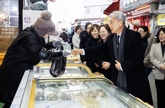 또한, 시장에서 직접 온누리상품권으로 설 성수품을 포함한 다양한 물품을 구매하며 지역경제 활성화를 위한 전통시장 이용과 물가 안정 캠페인을 실시했으며, 이날 구매한 물품은 지역 내 복지시설 지원을 위해 전달됐다.