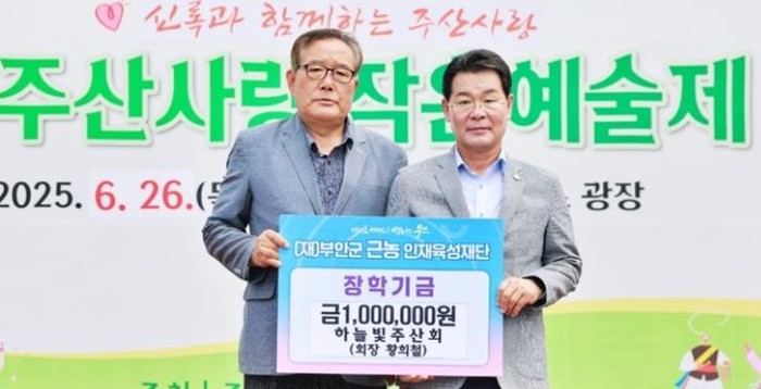 지난 26일 부안군 주산면 행정복지센터 광장에서 열린 주산사랑작은예술제에서 사단법인 하늘빛주산회는 부안군 청년들을 위해 근농장학금 100만원을 기부했다.