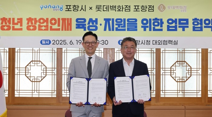 시는 19일 시청 대외협력실에서 롯데백화점 포항점과 청년 창업 인재 육성을 위한 업무 협약을 체결했다.