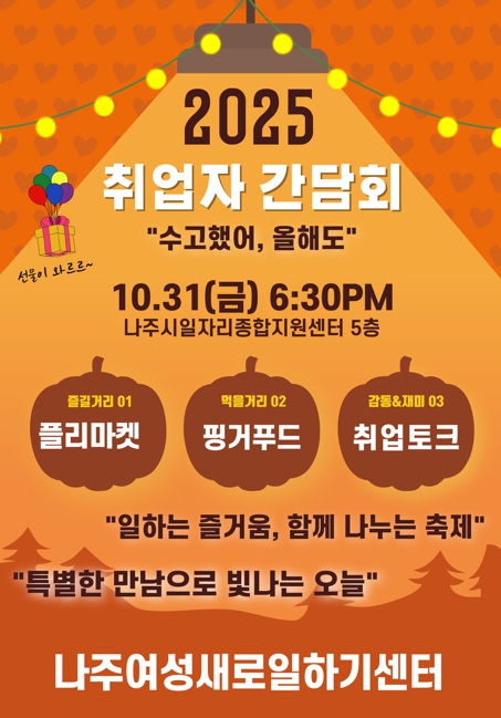 ▲ 나주여성새로일하기센터(센터장 최진아)는 오는 10월 31일 나주시 일자리종합지원센터에서 지역 여성 취업자 50여 명이 참여하는 취업자 간담회를 개최한다. 2025년 나주새일센터 취업자 간담회 포스터. |