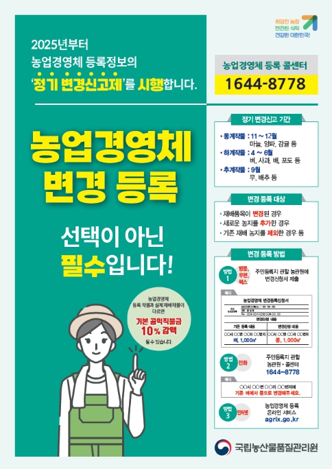 하지만 바쁜 영농활동과 의무에 대한 인식 부족 등으로 농업인이 제때 변경등록을 하지 않고 있어 지원 사업에서 배제되는 등의 불이익을 받을 우려가 있다.