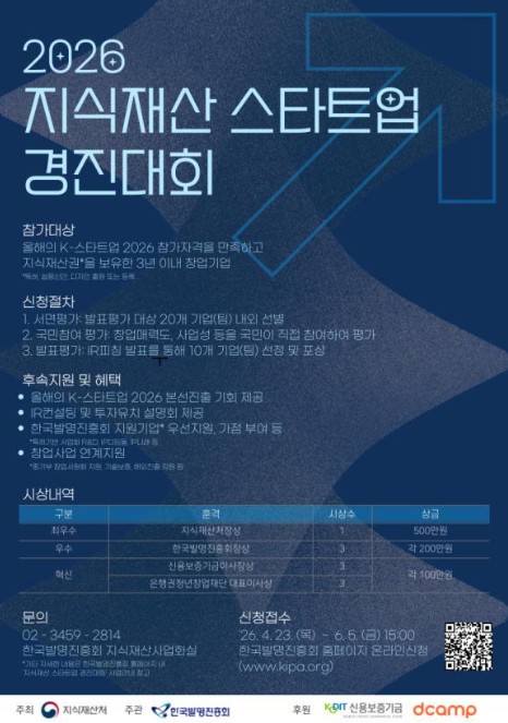 지식재산처는 신용보증기금, 은행권청년창업재단(디캠프), 한국발명진흥회와 함께 4월 23일 ~ 6월 5일까지'2026 지식재산 스타트업 경진대회'참가기업을 모집한다고 밝혔다.