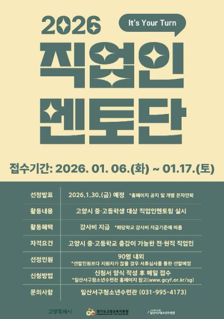 고양시청소년재단 일산서구청소년수련관이 청소년들의 진로 탐색·설계를 지원하기 위한 ‘2026 직업인멘토단’을 모집한다고 밝혔다.