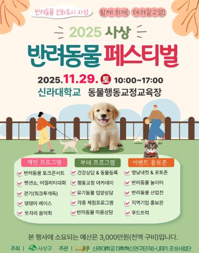 사상구는 신라대학교 I-URP사업단과 협력해 오는 29일 오전 10시 신라대학교 동물행동교정교육장 일원에서 ‘2025 사상 반려동물 페스티벌’을 개최한다고 19일 밝혔다.