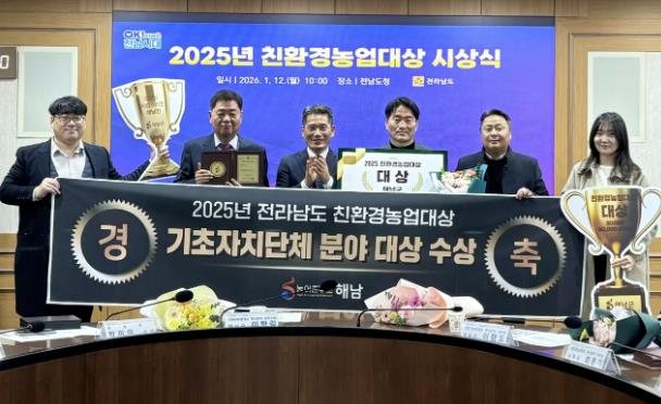 해남군이 전라남도‘2025년 친환경농업대상’평가에서 대상을 수상했다. 2년연속 대상 수상으로, 우리나라 친환경농업 선도 지자체의 위상을 확고히 했다. 해남군은 상사업비 8,000만원도 확보했다.