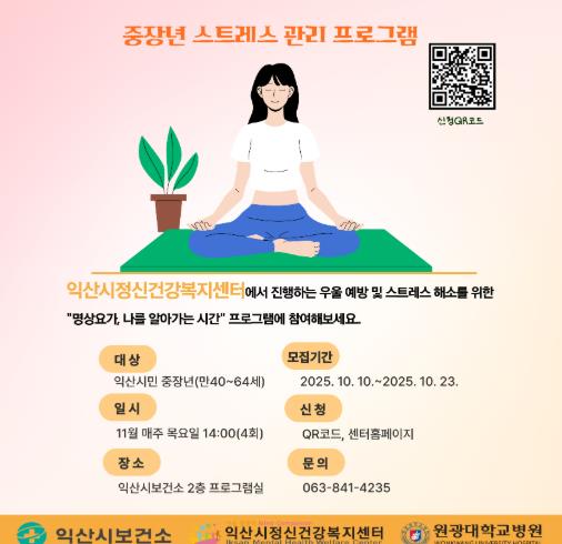 익산시정신건강복지센터는 만 40~64세 중장년을 대상으로 '마음힐링 명상요가' 프로그램을 운영한다고 10일 밝혔다.