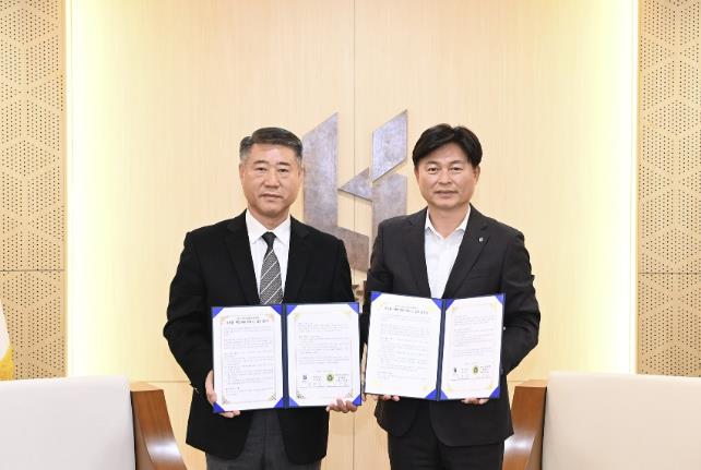 | ▲ 조용익 부천시장(오른쪽)과 강옥동 부천시호남향우회 총연합회장이 ‘핸썹해피하우스’ 협약식 기념사진을 찍고 있다. |