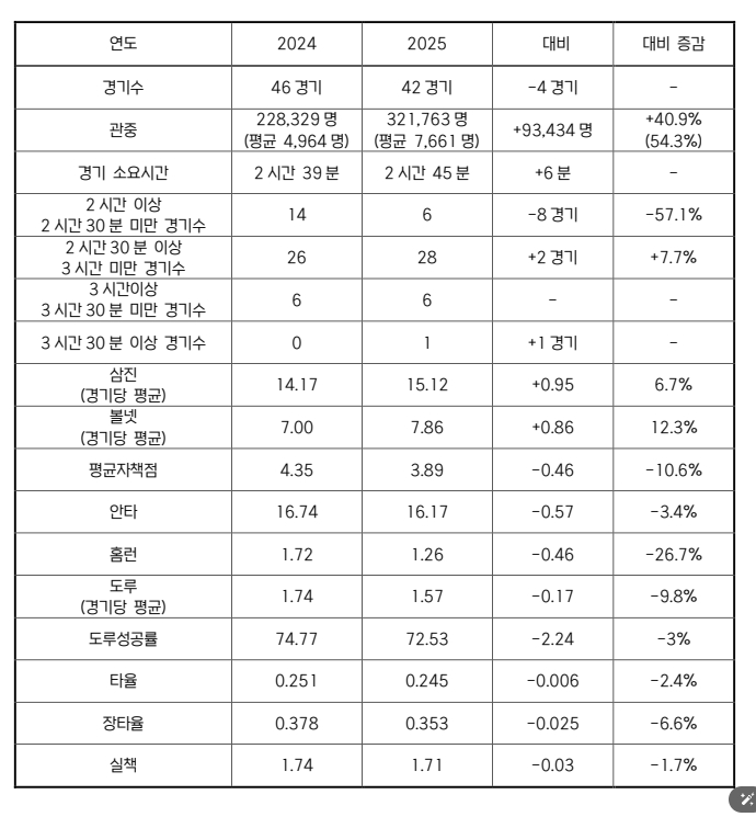 경기 평균 소요 시간은 2시간 45분으로 2024년 대비 6분 늘었으며, 경기당 삼진 15.12개, 볼넷 7.86개로 지난해 대비 각각 6.7%, 12.3% 증가했다.
