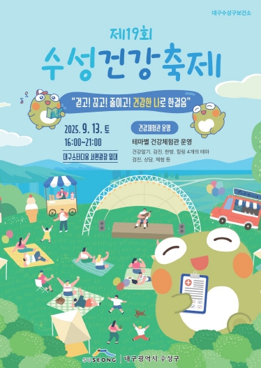 대구 수성구에서 주최하는 '제19회 수성건강축제'가 오는 13일 오후 4시부터 9시까지 대구스타디움 서편광장 일대에서 개최된다.