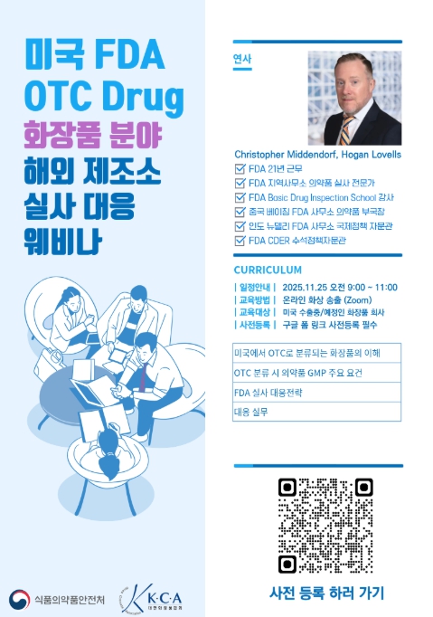 주요 내용은 ▲미국에서 일반의약품으로 분류되는 화장품의 이해 ▲일반의약품으로 분류될 경우 적용되는 의약품 GMP 요구사항 ▲미국 식품의약품청(FDA) 실사 대응 전략 및 실무 등 국내 업계가 FDA로부터 실사를 받을 때 도움이 될 만한 내용으로 구성했으며, 강사로는 FDA에서 근무한 경력이 있는 전문가를 초빙했다.