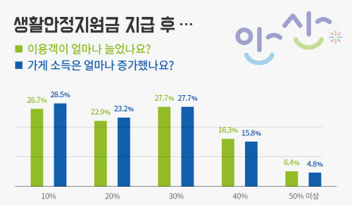 설문에 참여한 가맹점주 전원은 생활안정지원금 지급 후 이용자와 가게 매출이 모두 10% 이상 증가했다고 답했다. 이용객과 매출이 30% 이상 증가했다고 응답한 가맹점주는 각각 50.4%, 48.3%에 달해 절반에 가까운 것으로 나타났다.