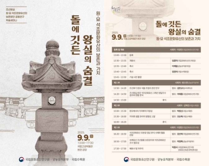 국가유산청 국립문화유산연구원과 궁능유적본부는 산림청 국립수목원과 함께 오는 9월 9일 오후 1시 국립고궁박물관 본관 강당(서울 종로구)에서 ‘돌에 깃든 왕실의 숨결, 원·묘 석조문화유산의 보존과 가치’를 주제로 학술발표회(세미나)를 공동 개최한다.