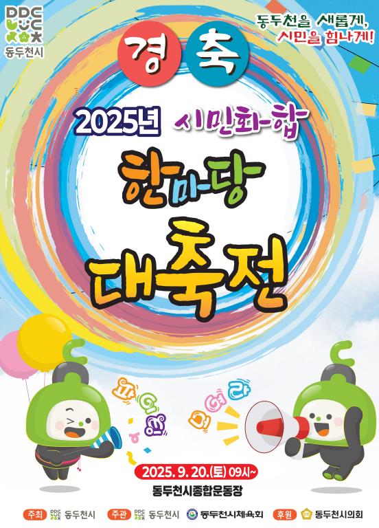동두천시는 오는 9월 20일(토) 동두천 종합운동장에서 '2025 시민화합 한마당 대축전'을 성대히 개최한다. 행사는 동두천시가 주최하고 동두천시와 동두천시체육회가 공동 주관한다.