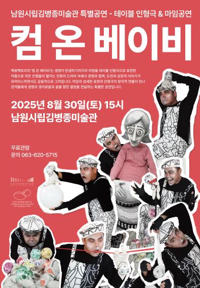 남원시립김병종미술관에서는 2025년 8월 30일 오후 3시 ‘컴 온 베이비(테이블 인형극 & 마임공연)’뮤지엄콘서트 특별공연을 개최한다.