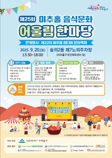 인천 미추홀구는 오는 20일 숭의2동 제7노외주차장(미추홀구국민체육센터 앞)에서 ‘제25회 미추홀 음식문화 어울림 한마당’을 개최한다.